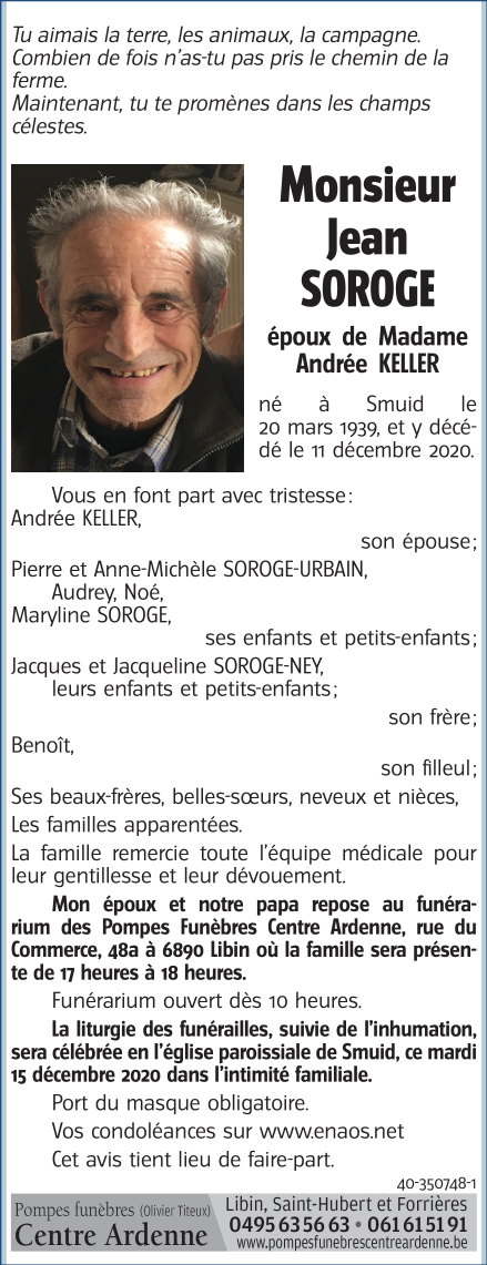 Décédé à Smuid (6890) le vendredi 11 décembre 2020 à l'âge de 81 ans