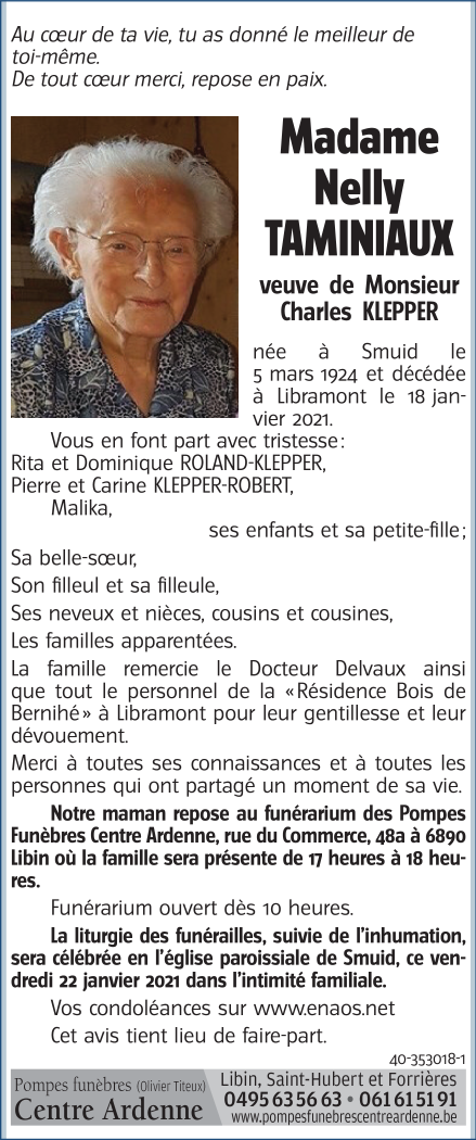 Décédée à Libramont (6800) le lundi 18 janvier 2021 à l'âge de 96 ans