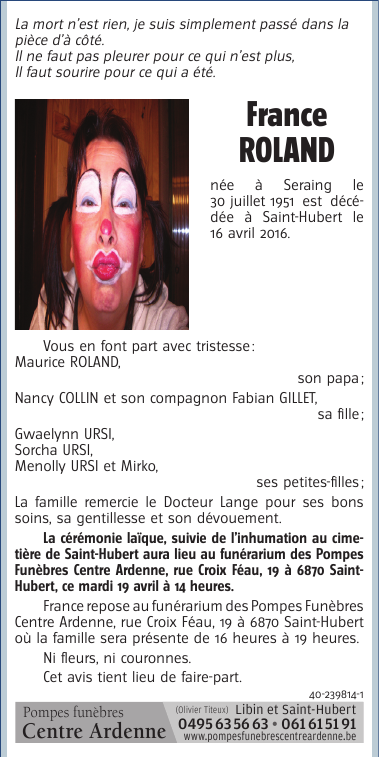 Décédée à Saint-Hubert (6870) le samedi 16 avril 2016 à l'âge de 64 ans