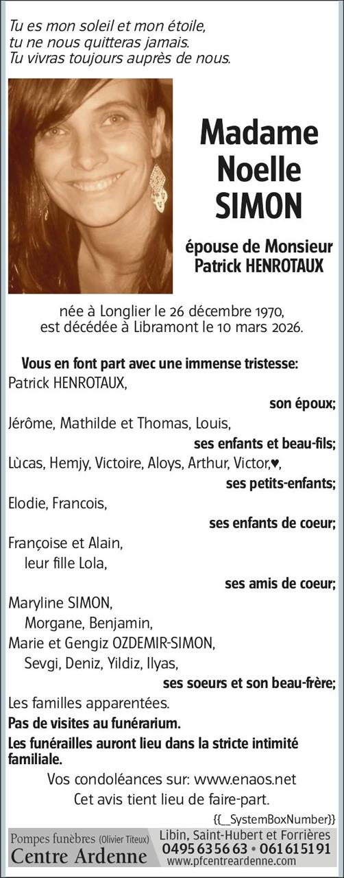 Décédée à Libramont (6800) le mardi 10 mars 2026 à l'âge de 55 ans