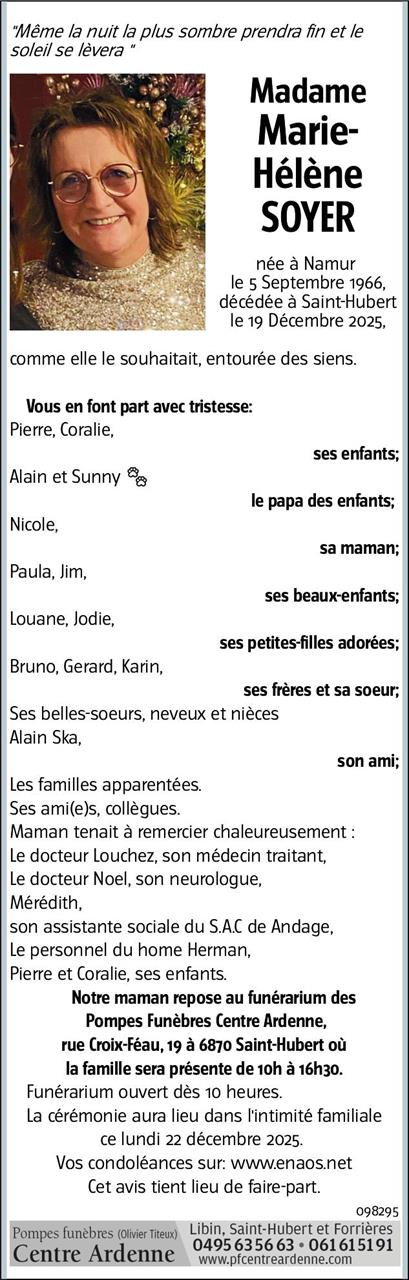 Décédée à Saint-Hubert (6870) le vendredi 19 décembre 2025 à l'âge de 59 ans