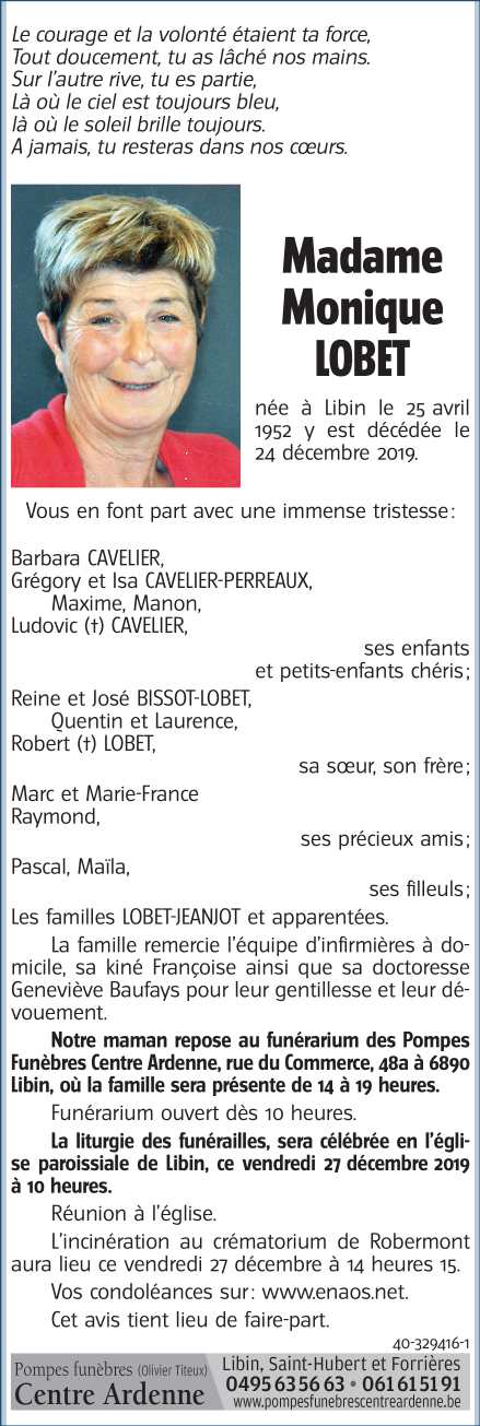 Décédée à Libin (6890) le mardi 24 décembre 2019 à l'âge de 67 ans