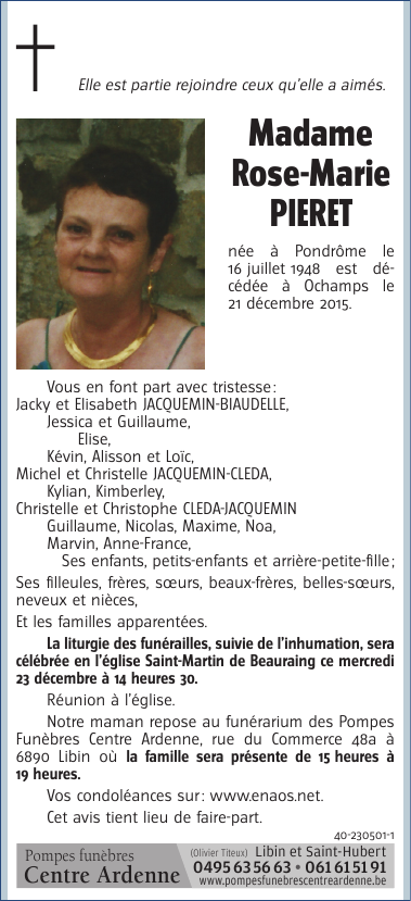 Décédée à Ochamps (6890) le lundi 21 décembre 2015 à l'âge de 67 ans