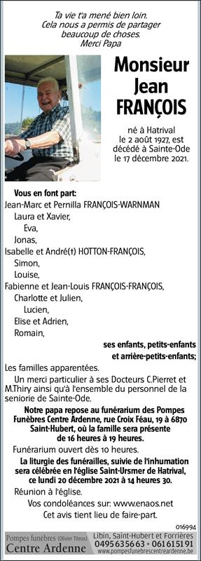 Décédé à Sainte-Ode (6680) le vendredi 17 décembre 2021 à l'âge de 94 ans