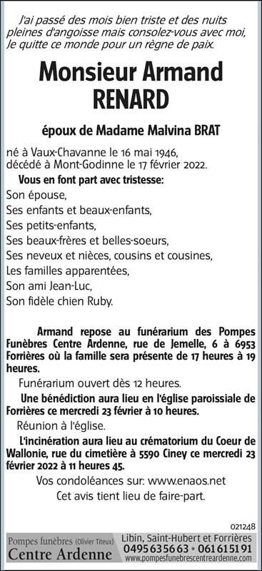 Décédé à Mont-Godinne (5530) le jeudi 17 février 2022 à l'âge de 75 ans