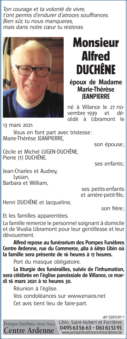 Décédé à Libramont (6800) le samedi 13 mars 2021 à l'âge de 81 ans