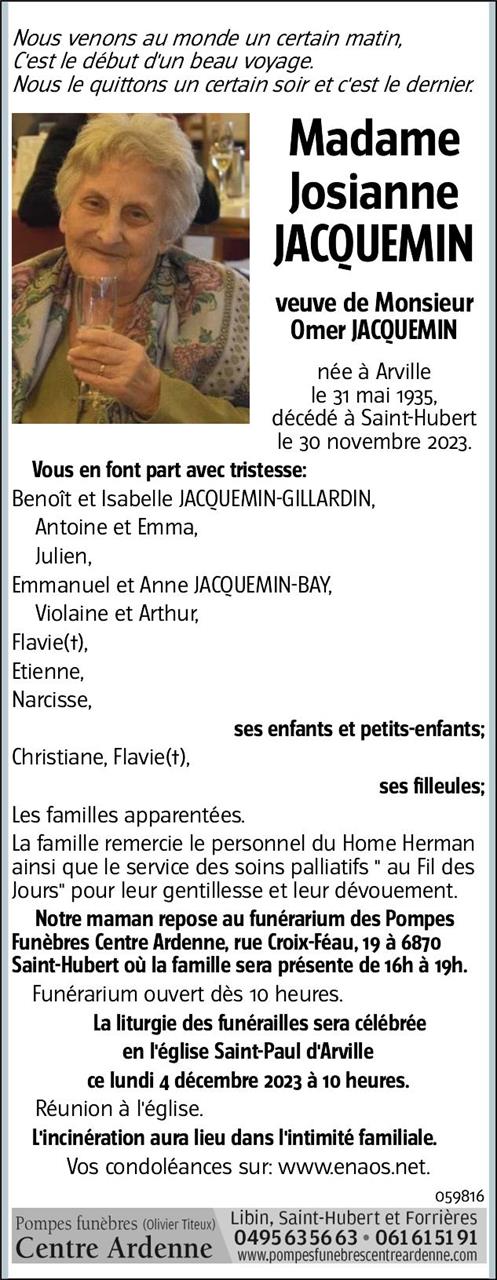 Décédée à Saint-Hubert (6870) le jeudi 30 novembre 2023 à l'âge de 88 ans