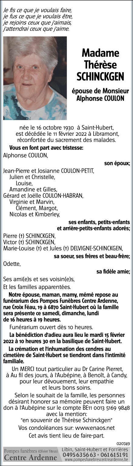 Décédée à Libramont-Chevigny (6800) le vendredi 11 février 2022 à l'âge de 91 ans