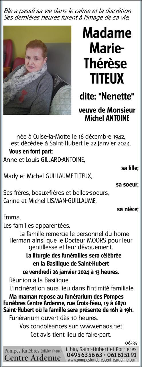 Décédée à Saint-Hubert (6870) le lundi 22 janvier 2024 à l'âge de 81 ans
