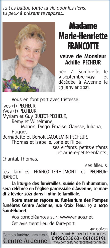 Décédée à Awenne (6870) le vendredi 29 janvier 2021 à l'âge de 81 ans