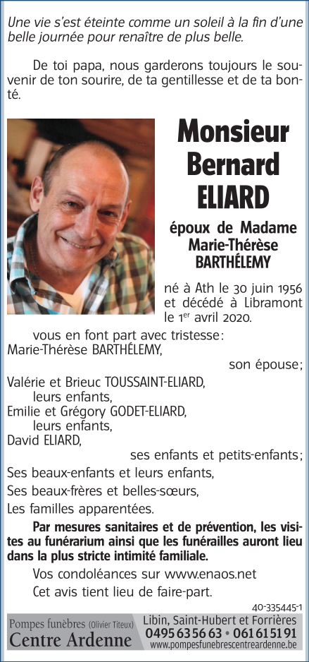 Décédé à Libramont-Chevigny (6800) le mercredi 1 avril 2020 à l'âge de 63 ans