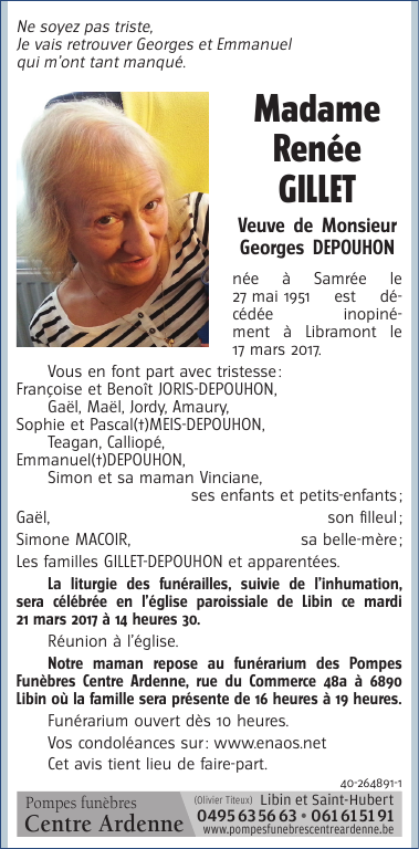 Décédée à Libramont (6800) le vendredi 17 mars 2017 à l'âge de 65 ans