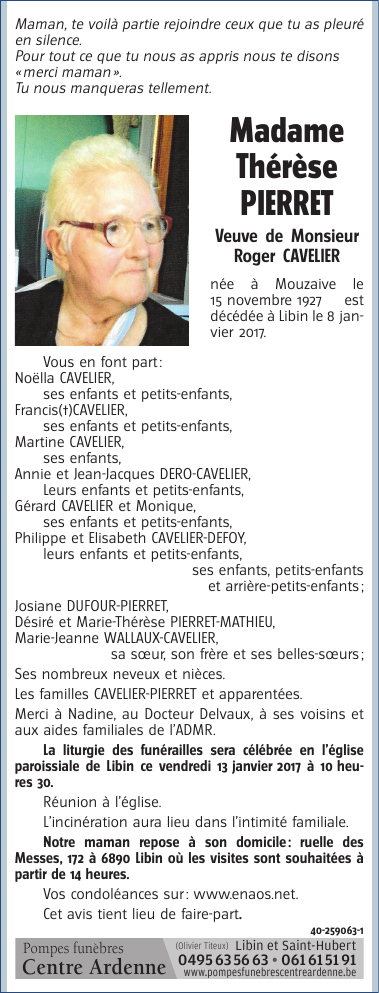 Décédée à Libin (6890) le dimanche 8 janvier 2017 à l'âge de 89 ans