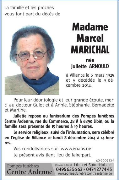 Décédée à Villance (6890) le vendredi 5 décembre 2014 à l'âge de 89 ans
