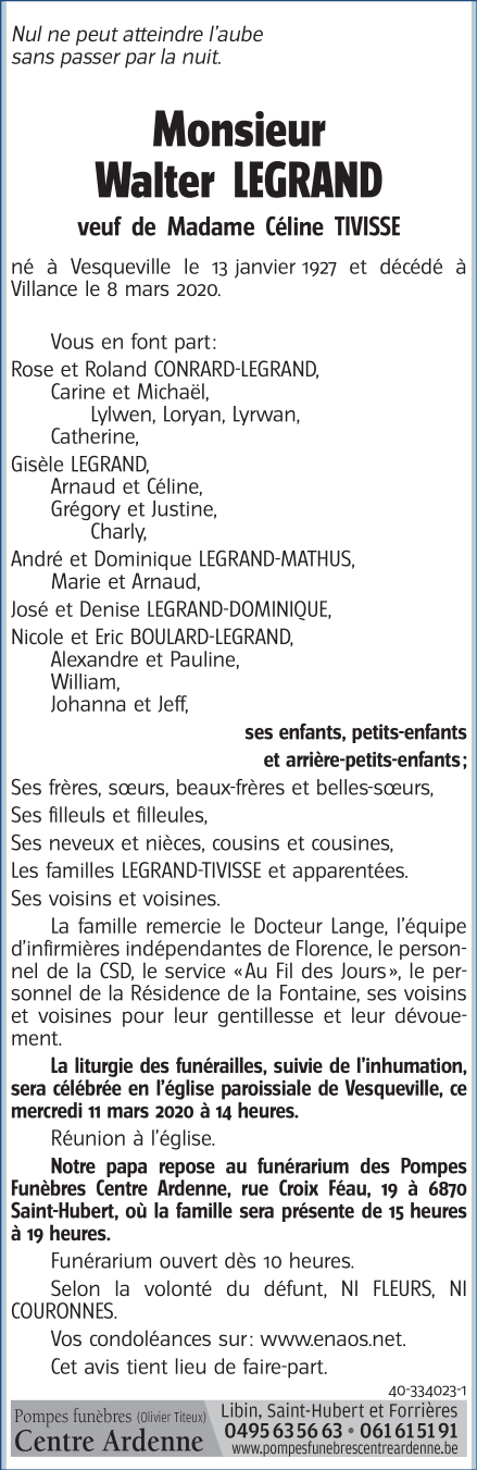 Décédé à Villance (6890) le dimanche 8 mars 2020 à l'âge de 93 ans