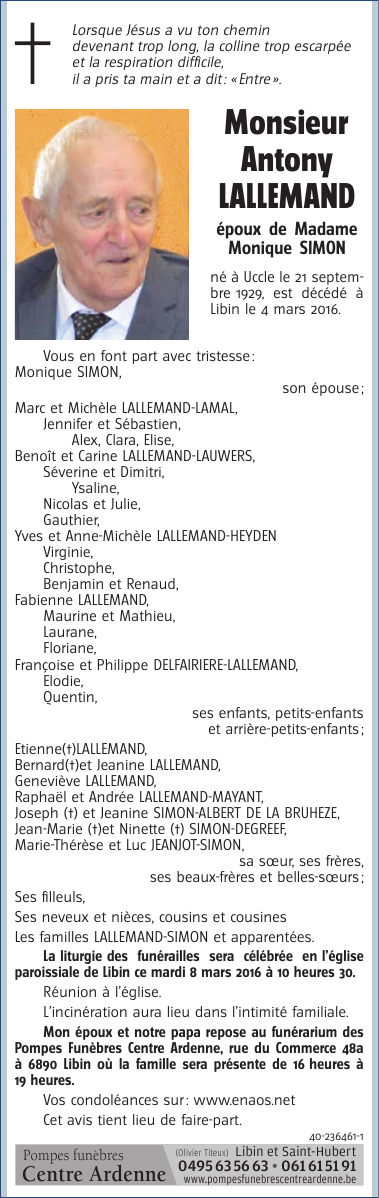 Décédé à Libin (6890) le vendredi 4 mars 2016 à l'âge de 86 ans