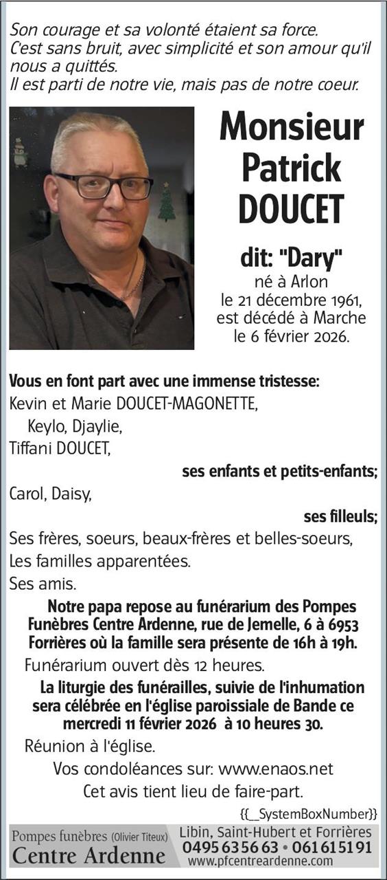 Décédé à Marche-en-Famenne (6900) le vendredi 6 février 2026 à l'âge de 64 ans