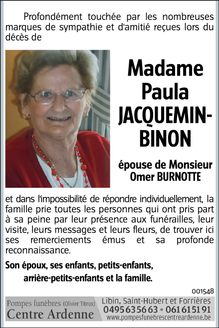 Décédée à Redu (6890) le mercredi 7 avril 2021 à l'âge de 90 ans