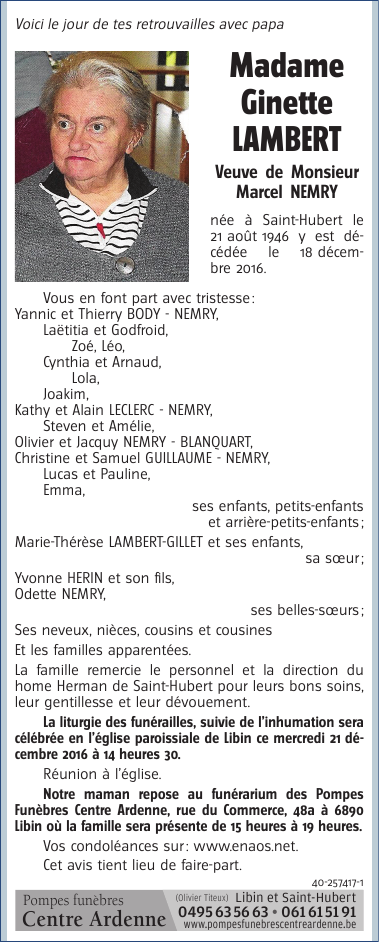 Décédée à Saint-Hubert (6870) le dimanche 18 décembre 2016 à l'âge de 70 ans