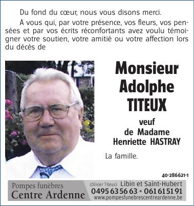 Monsieur Adolphe TITEUX Veuf de Madame Henriette HASTRAY