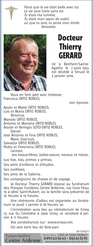 Décédé à Smuid (6890) le dimanche 3 janvier 2016 à l'âge de 62 ans