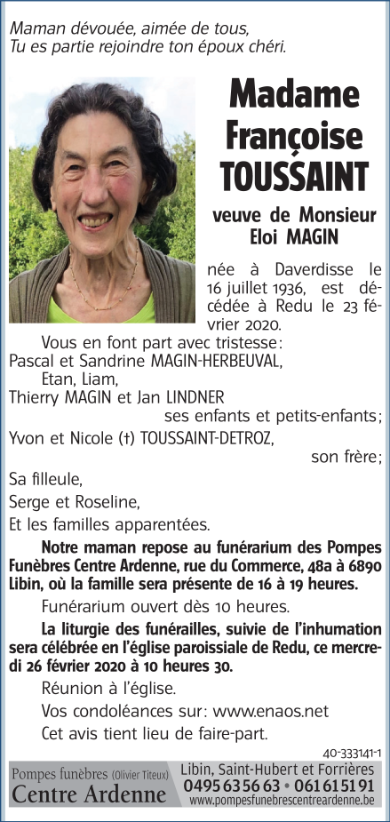 Madame Françoise TOUSSAINT veuve de Monsieur Eloi MAGIN