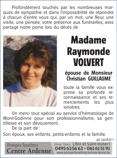 Décédée à Mont-Godinne (5530) le samedi 16 avril 2016 à l'âge de 73 ans