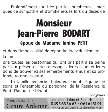 Décédé à Dinant (5500) le jeudi 17 mars 2016 à l'âge de 77 ans