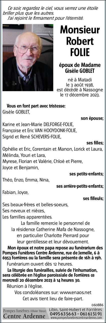 Décédé à Nassogne (6950) le dimanche 17 décembre 2023 à l'âge de 85 ans
