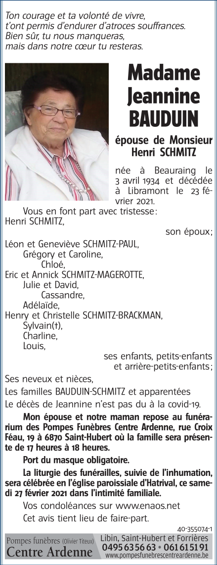 Décédée à Libramont-Chevigny (6800) le mardi 23 février 2021 à l'âge de 86 ans